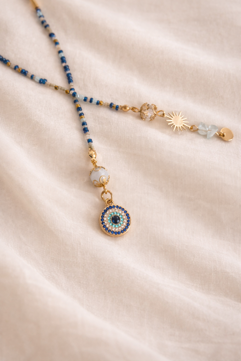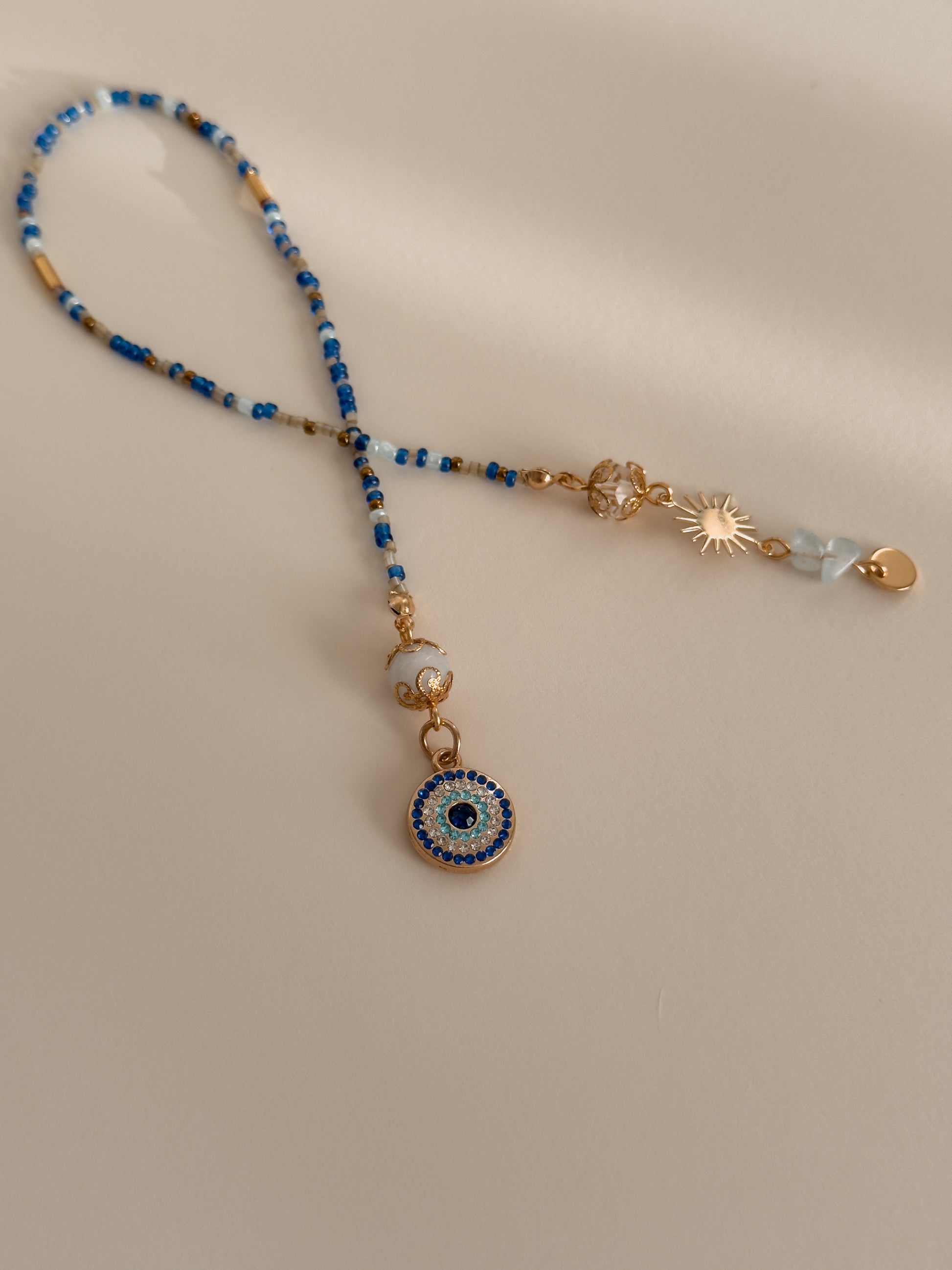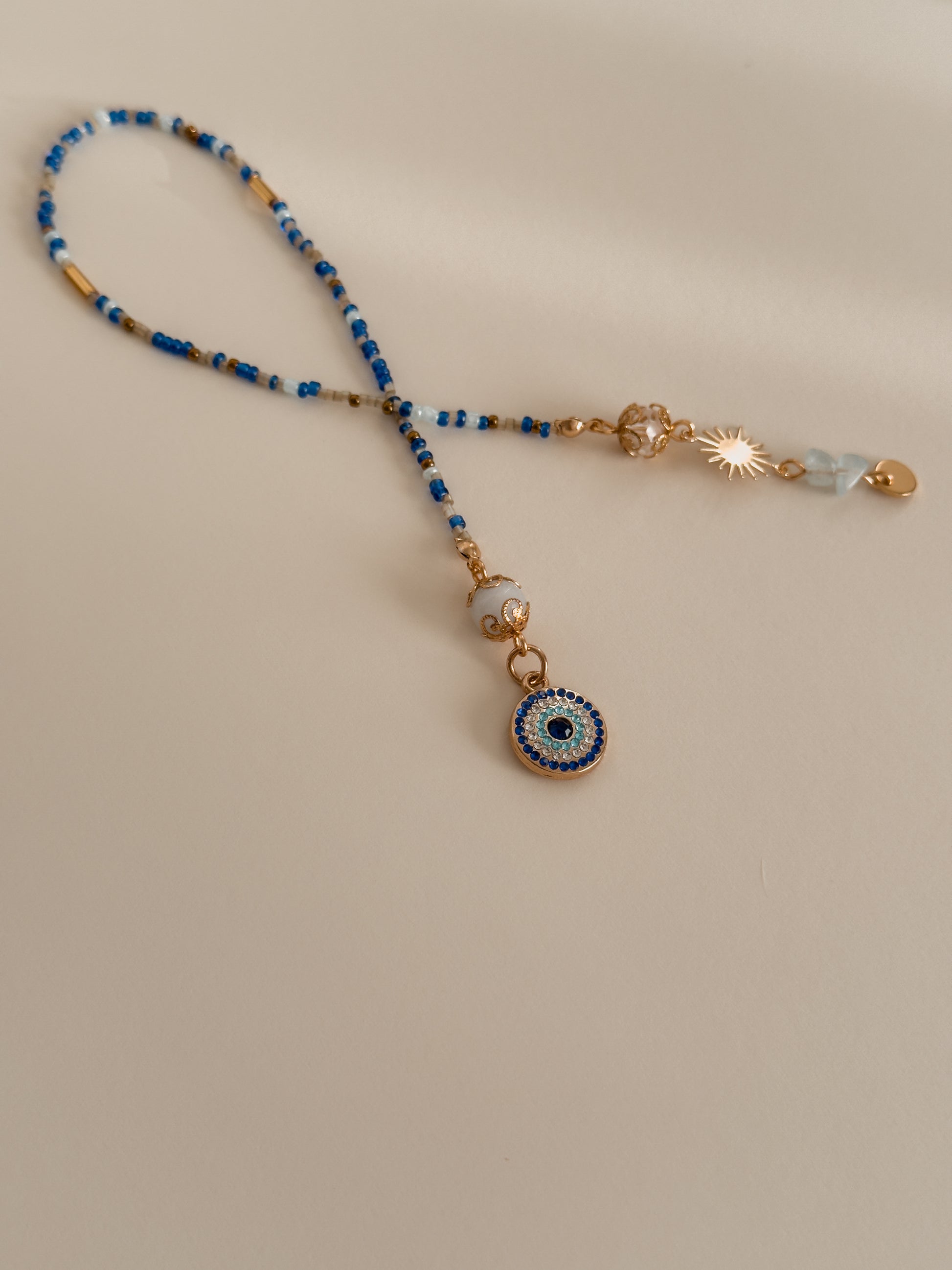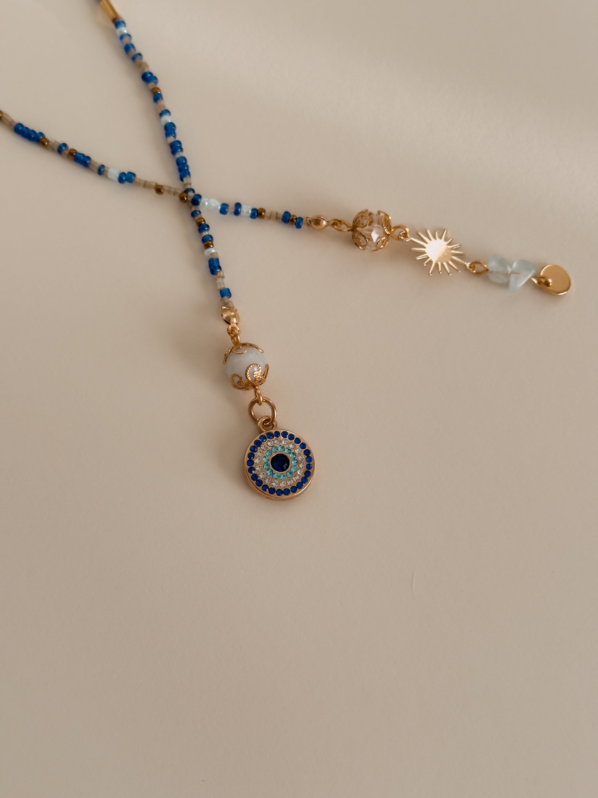• Materials: Aquamarine gemstone, gold plated elements, seed beads.