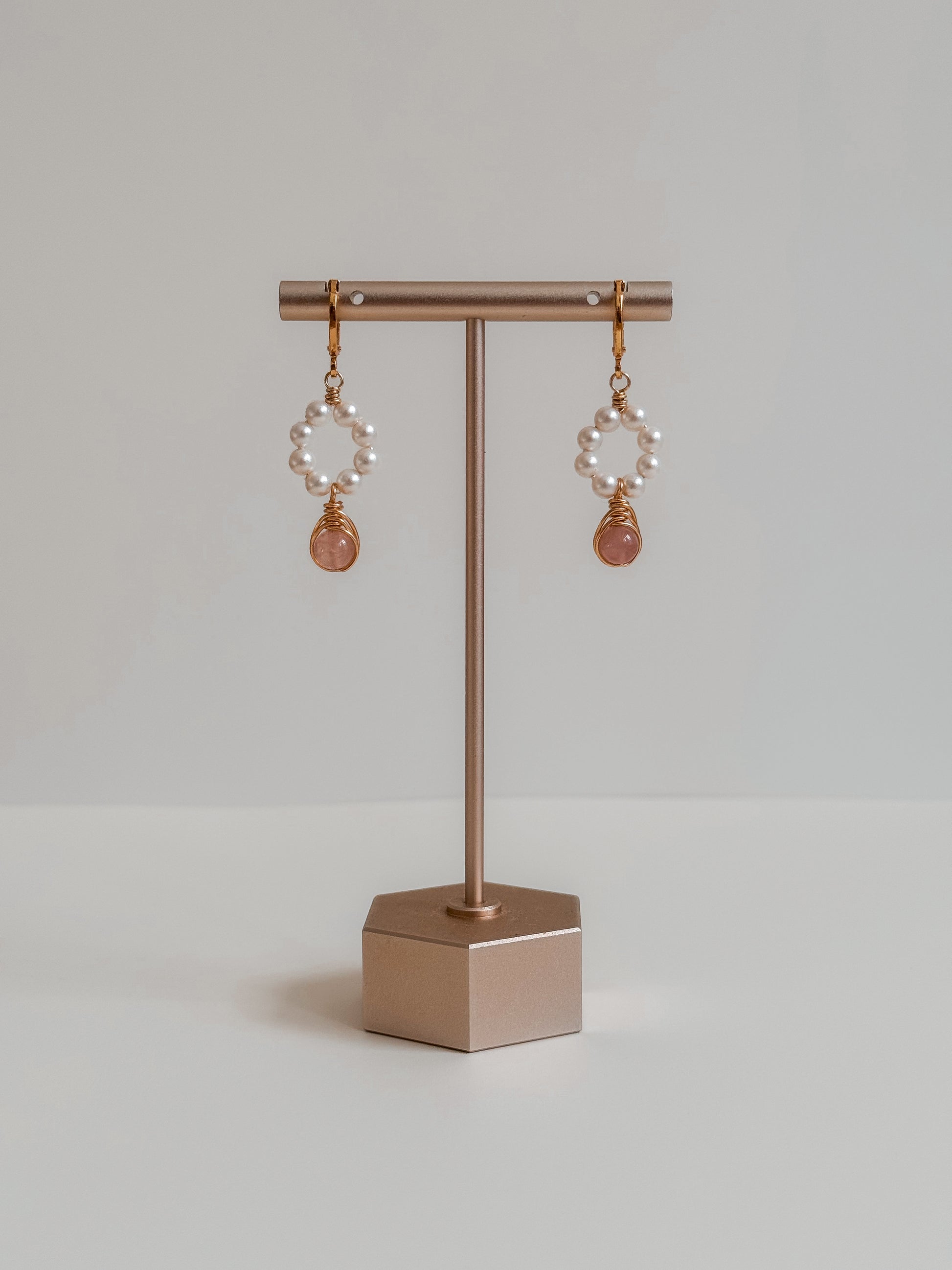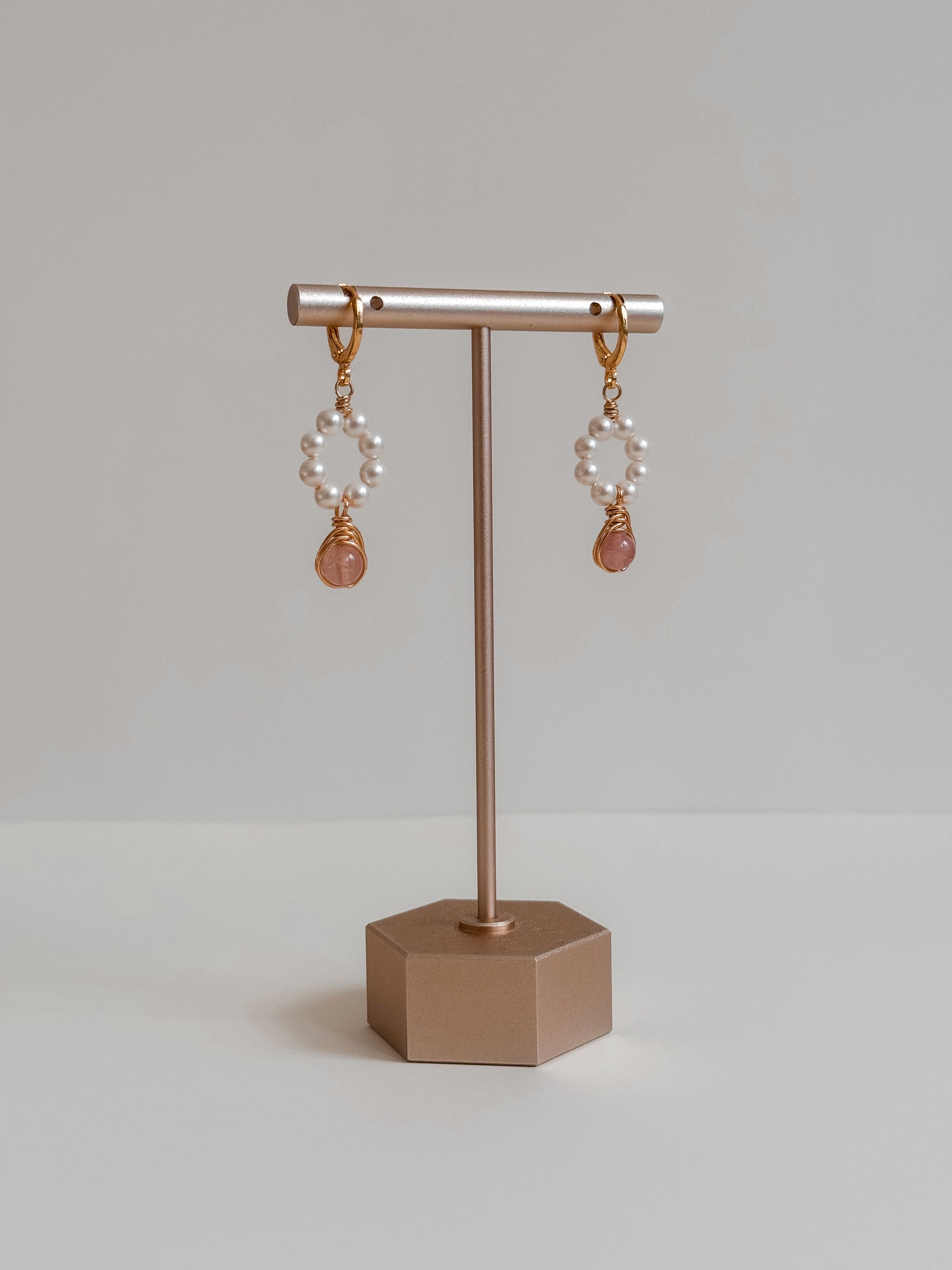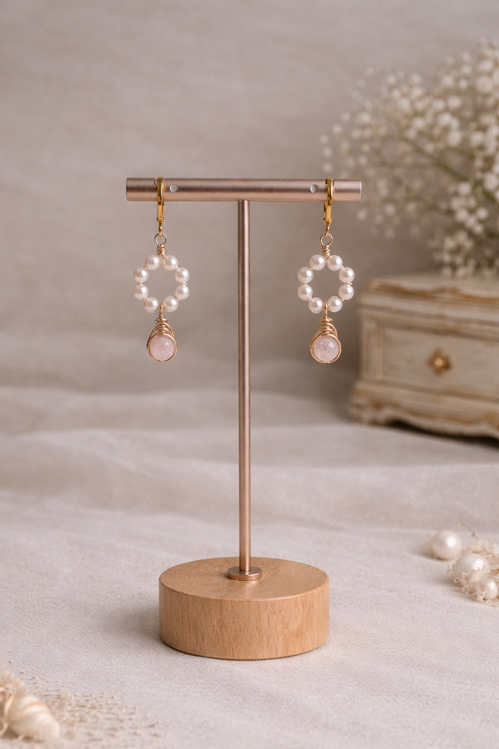 These delicate earrings feature beautifully crafted pearls and gold plating. At their center, genuine rose quartz gemstones bring a touch of natural beauty and the soothing energy of unconditional love.