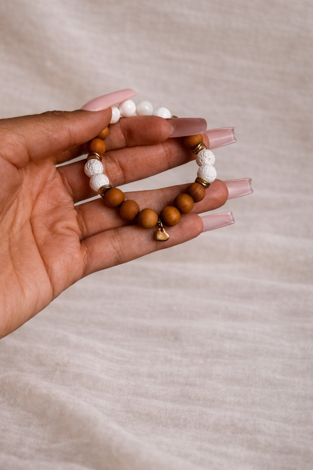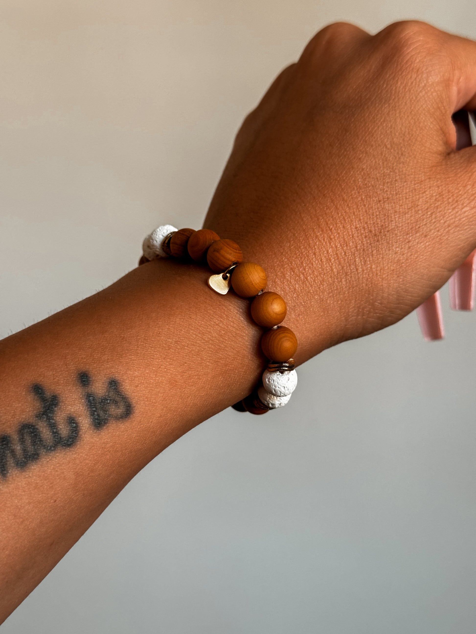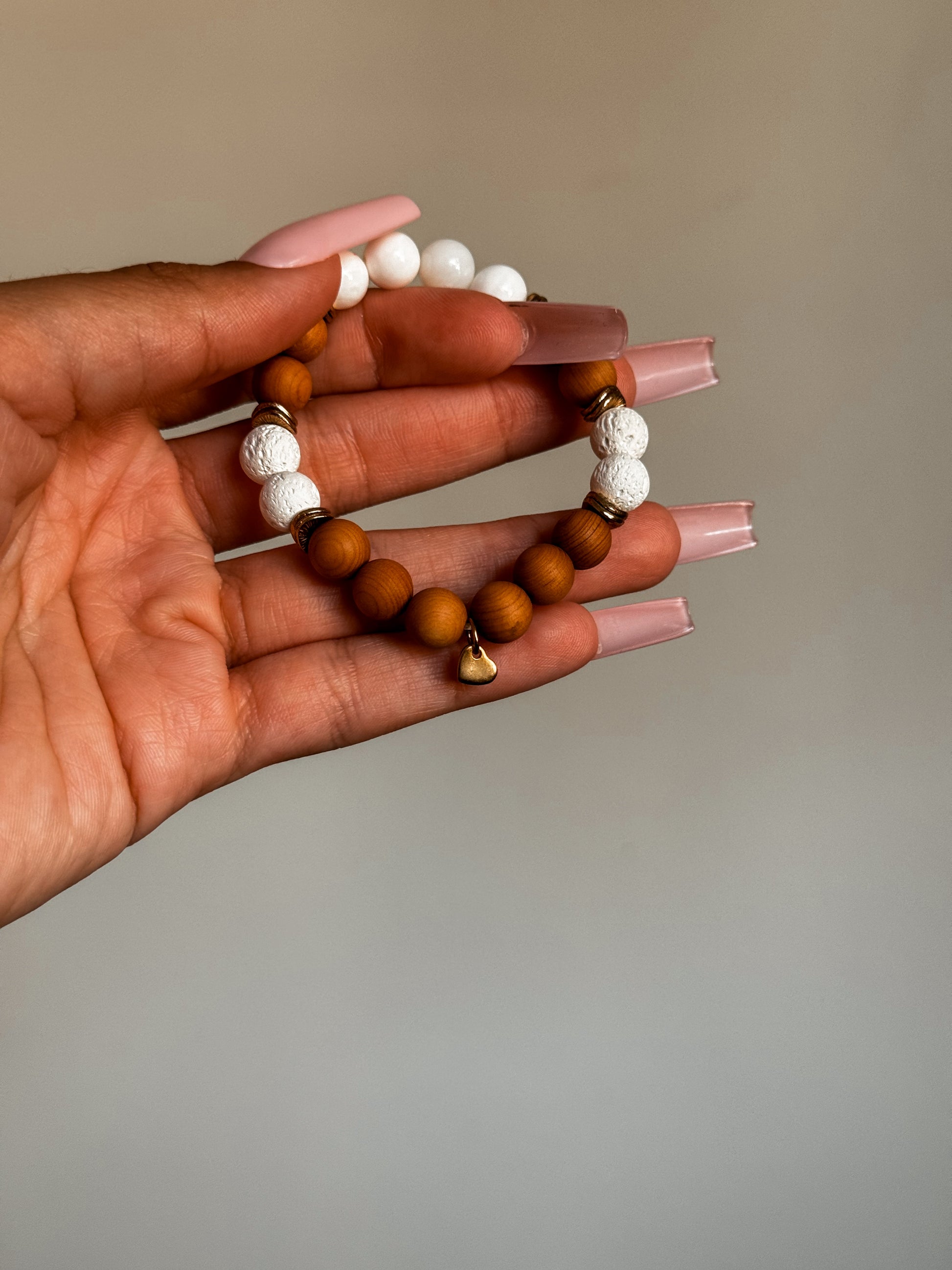 Material: Wood beads, White Lava Beads, White Shell, Gold Plated findings.